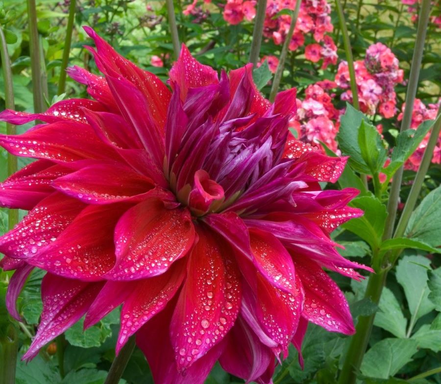 Dahlia, Babylon Paars, Decorative Type.  Summer and autumn flowering perennial.   Flower Size measures 22 cm across. Produces large dinner plate size vibrant purplish red blooms.   Perfect for the herbaceous border or in a bed of their own.