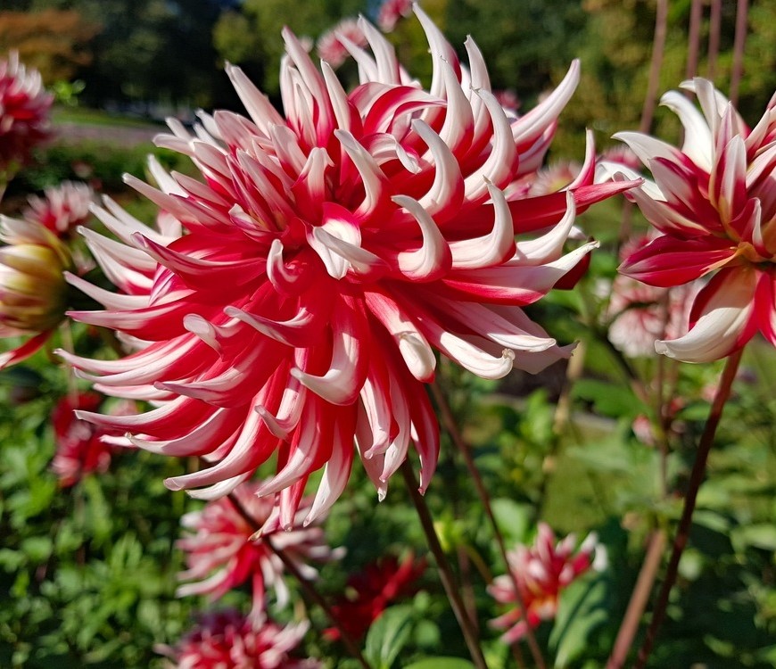 Dahlia Frigoulet. Cactus Type. Summer and autumn flowering perennial. Flower Size measures 14 cm across with a height of 120 cm, a tall dahlia white tipped red blooms. Perfect for the herbaceous border or in a bed of their own.