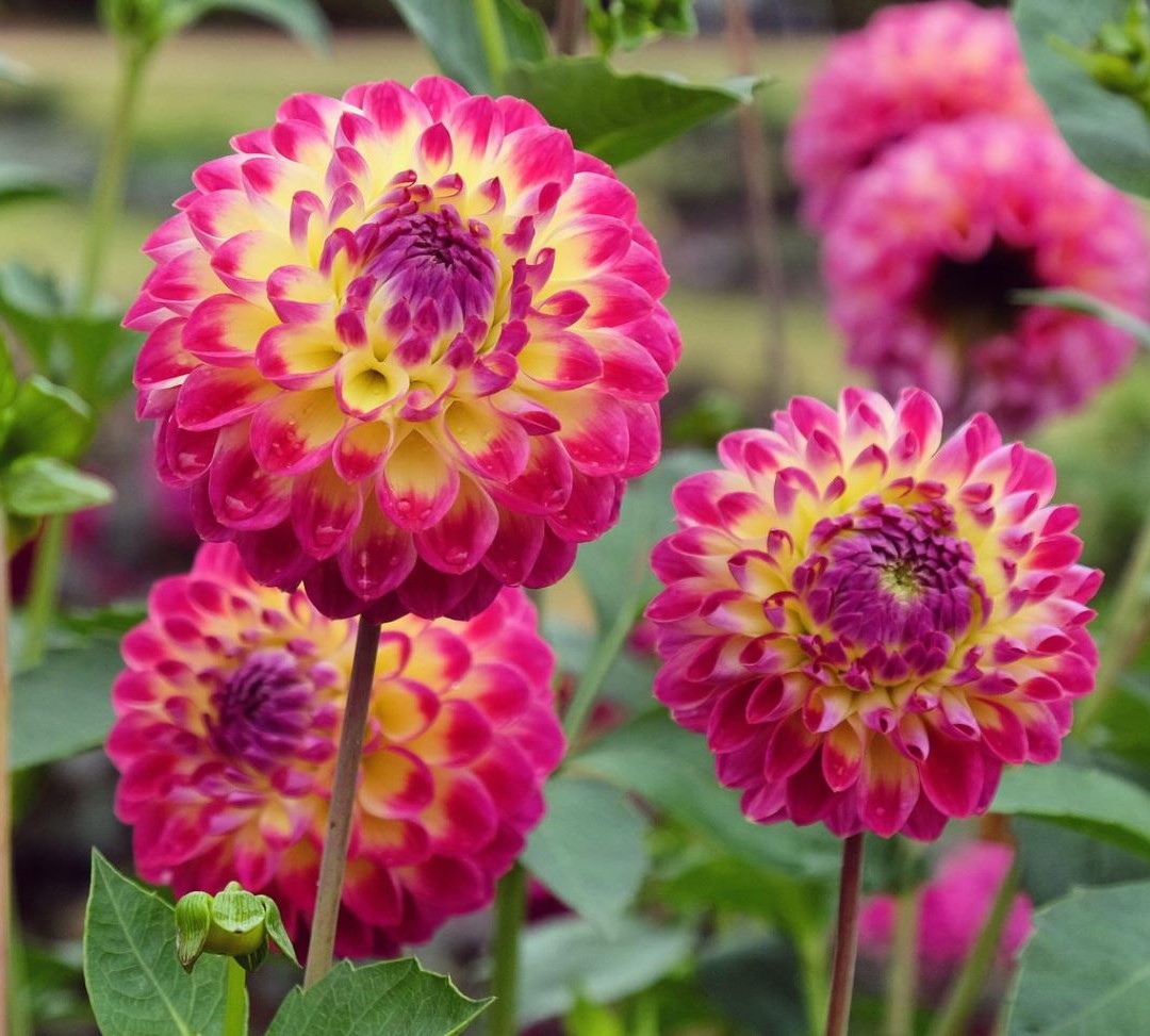 Dahlia Hapet Daydream. Ball Type. Summer and autumn flowering perennial. Flower Size measures 9 cm across, height 90 cm. A stunning dahlia variety featuring perfectly formed, vibrant ball-shaped flowers made up of lilac, pink and yellow petals. Perfect for the herbaceous border or in a bed of their own.