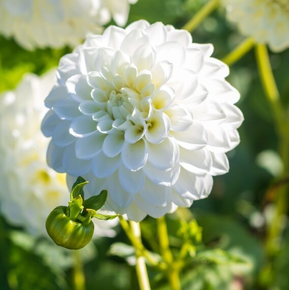 Dahlia, Petra’s Wedding. Pompon Type. Popular for cut flowers due to their strong stems and small flower-heads measuring only 11 cm across. Summer and autumn flowering perennial. Needs well-drained soil and a sunny location. Perfect for the herbaceous border or in a bed of their own.