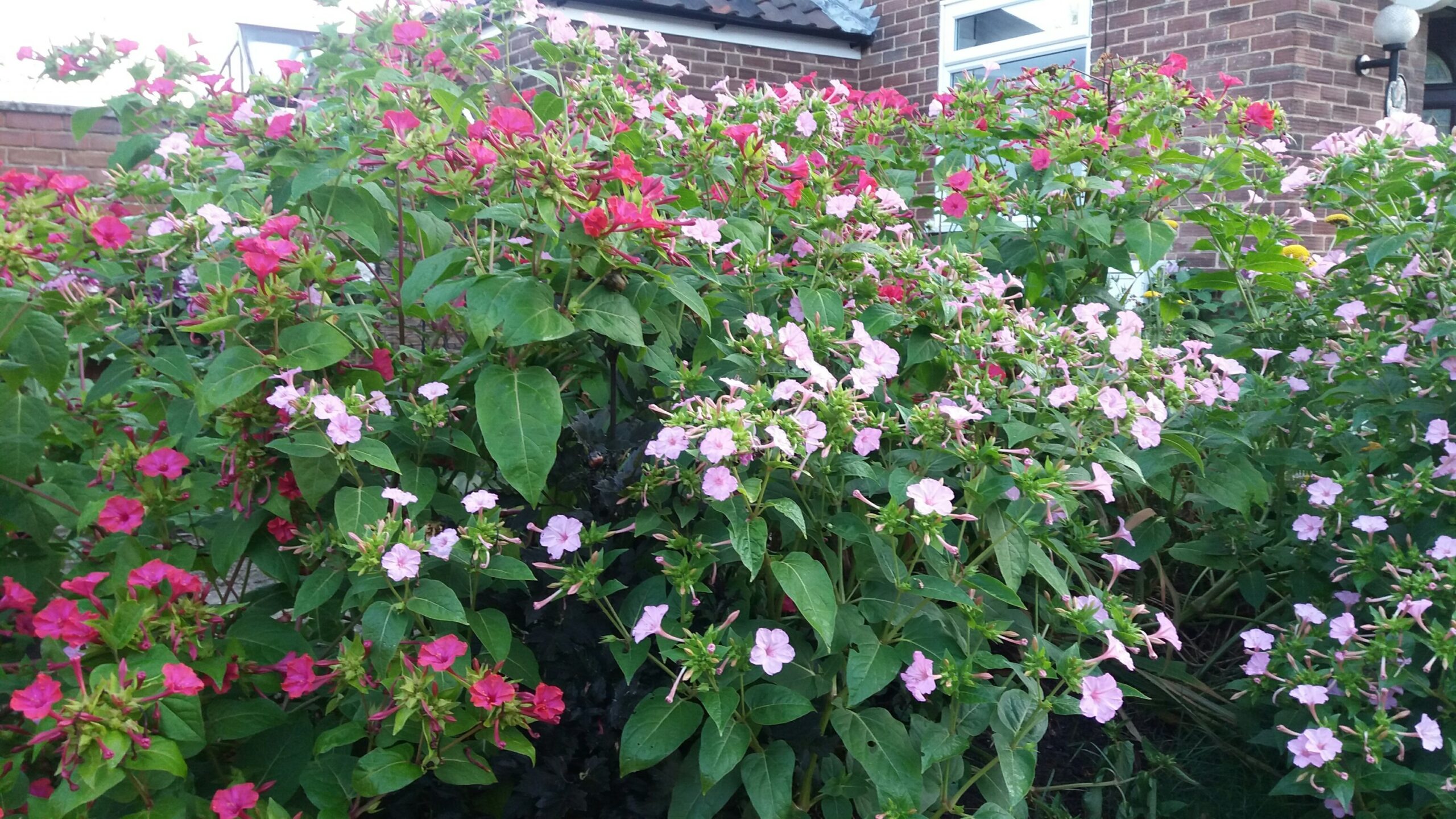 Mirabilis Jalapa, (four o’clock flower) Hardy Perennial. Best grown in the ground rather than pots. The bulbs look like black carrots and only ever come in mixed colours. However we are able to roughly judge colour by looking at the tip of the bulb, so you will receive a good mix, normally, pink, white, yellow, mauve. The images are from our garden. A beautiful strong perfume will fill your garden throughout the evening through to early morning.