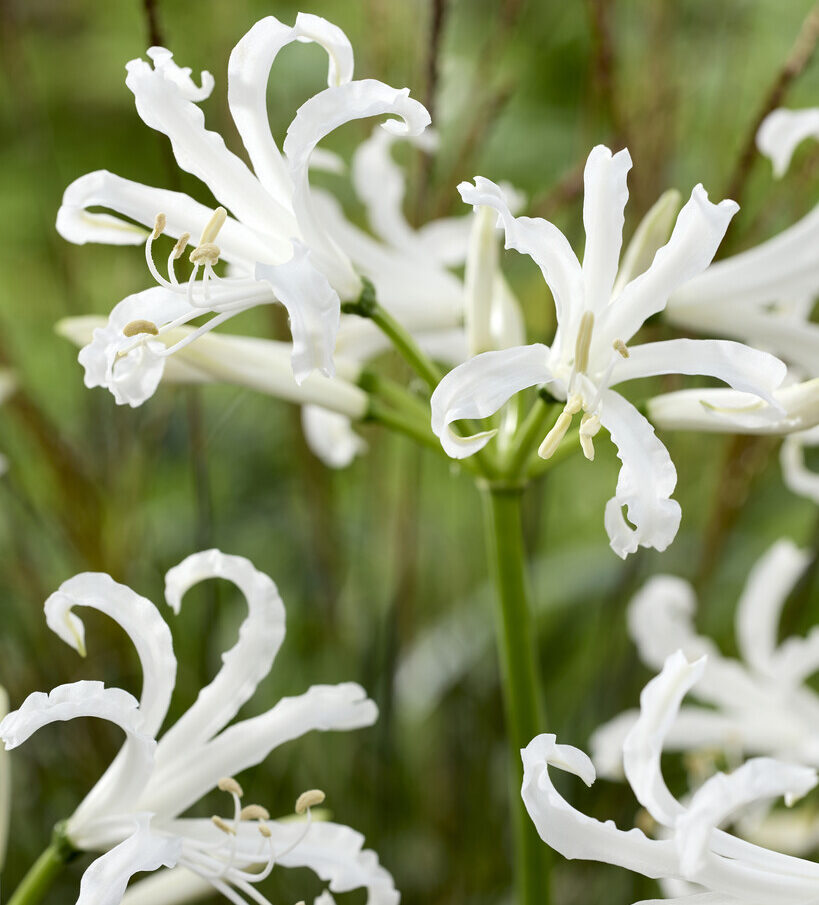 Nerine Bowdenii ‘Like a Virgin’ Frost hardy. Perennial. This is a stunning new Nerine variety! It features pure white, subtly scented blooms that come together in dense clusters on robust stems, reaching heights of 60 to 70 cm. Each bulb produces two stems, and its hardiness promises to elevate your garden for years to come.