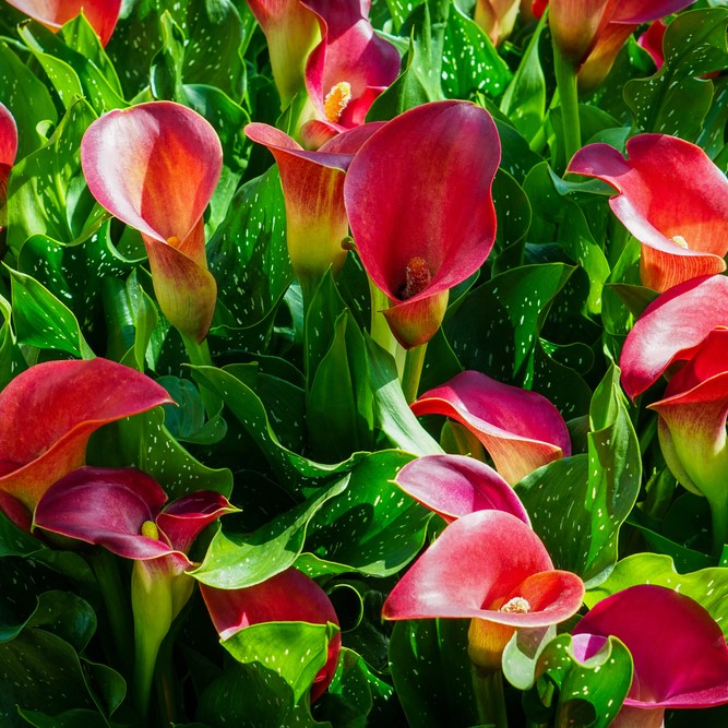 Zantedeschia ‘Bloody Mary®’. Half Hardy, Perennial. Reddish orange blooms against mottled green, broad foliage. This plant is suitable for cultivation in large pots or containers, although it can also be planted in the ground, provided it has well-drained soil and protection from frost.