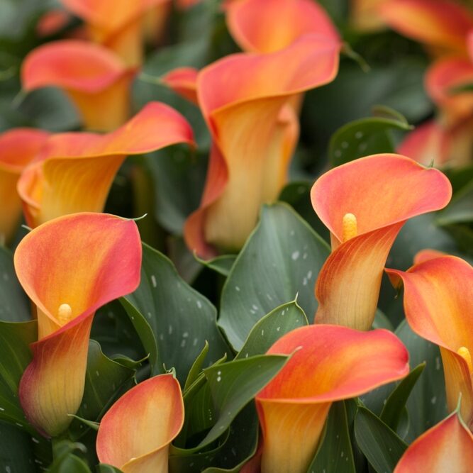 Zantedeschia ‘Lady Marmalade’ ®. Frost tender. Perennial. The vibrant apricot orange blooms create a stunning contrast against the rich, mottled green foliage. This plant thrives beautifully in large pots or containers, but if you decide to plant it in the ground, ensure the soil has good drainage and that it’s shielded from frost.